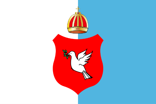 This is the flag used during the Kingdom of Viti from 1871-1874 before ceding to the British Empire in 1874. It features blue and white vertical stripes, with a red shield depicting a white dove in the centre.